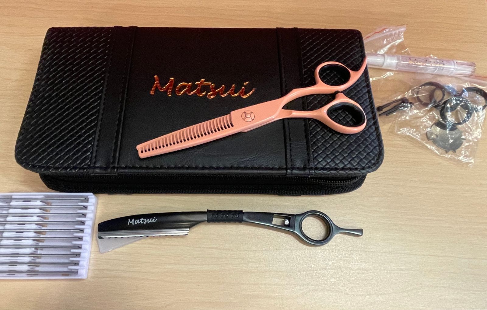 The absolute all new Matsui Pastel Peach Shears are here and boy are we inlove!? With the softest most perfect pastel peach colour, it's sure to have you feeling like it's summer all year round. Handcrafted with none other than Hitachi Japanese steel which as we all know is one of the best steels around that performs time and time again. These thinning shears will be the envy of every hairdresser that sees them.